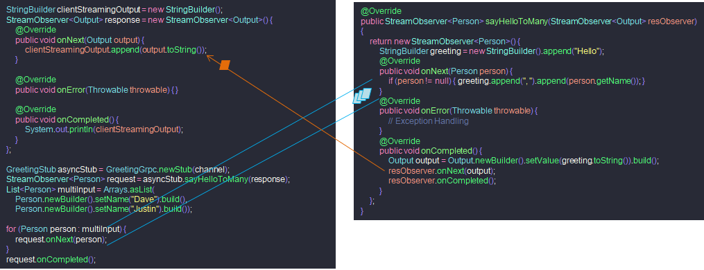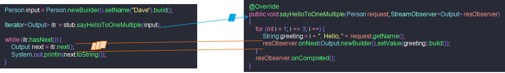 rpc sayHelloToOneMultiple(Person) returns (stream Output);