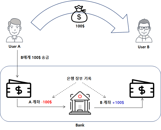 위 그림과 같이 기존의 전자 상거래를 보면 A는 B에게 온라인을 통한 송금 거래를 할 때 은행이라는 금융기관을 통해서 요청을 하고 실제로는 A 계좌의 돈을 차감, B 계좌의 돈을 증액 시키는 기록상의 변경이 일어난다. 하지만, 이 온라인 Payment에 대한 프로세스는 제 3의 기관을 통해서만 가능하다는 것이다.