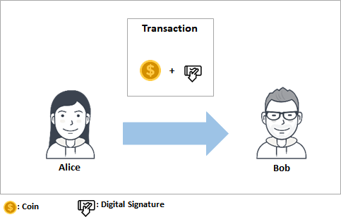 기본적으로 그림과 같이 Alice가 Bob에게 자산을 보낼 때는 공개키 기반의 전자서명을 포함해서 보낸다.